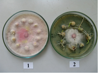 Germination of pea seeds on an agar medium, with a block of the pathogen Fusarium sporotrichioides in the center of the Petri dish.